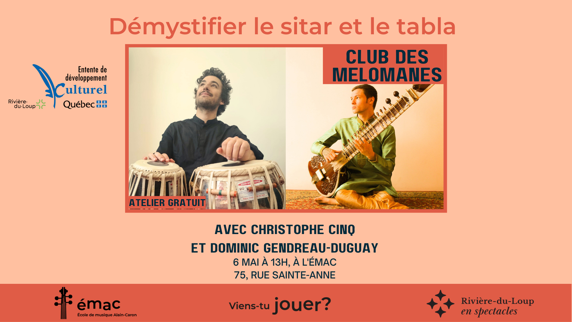 Le samedi 6 mai à 13h, le Club des Mélomanes de l’École de musique Alain-Caron (EMAC) tiendra son prochain atelier intitulé “Démystifier le sitar et le tabla”. Ces deux instruments de musique comptent parmi les plus populaires et les plus envoûtants de la musique classique du nord de l’Inde.